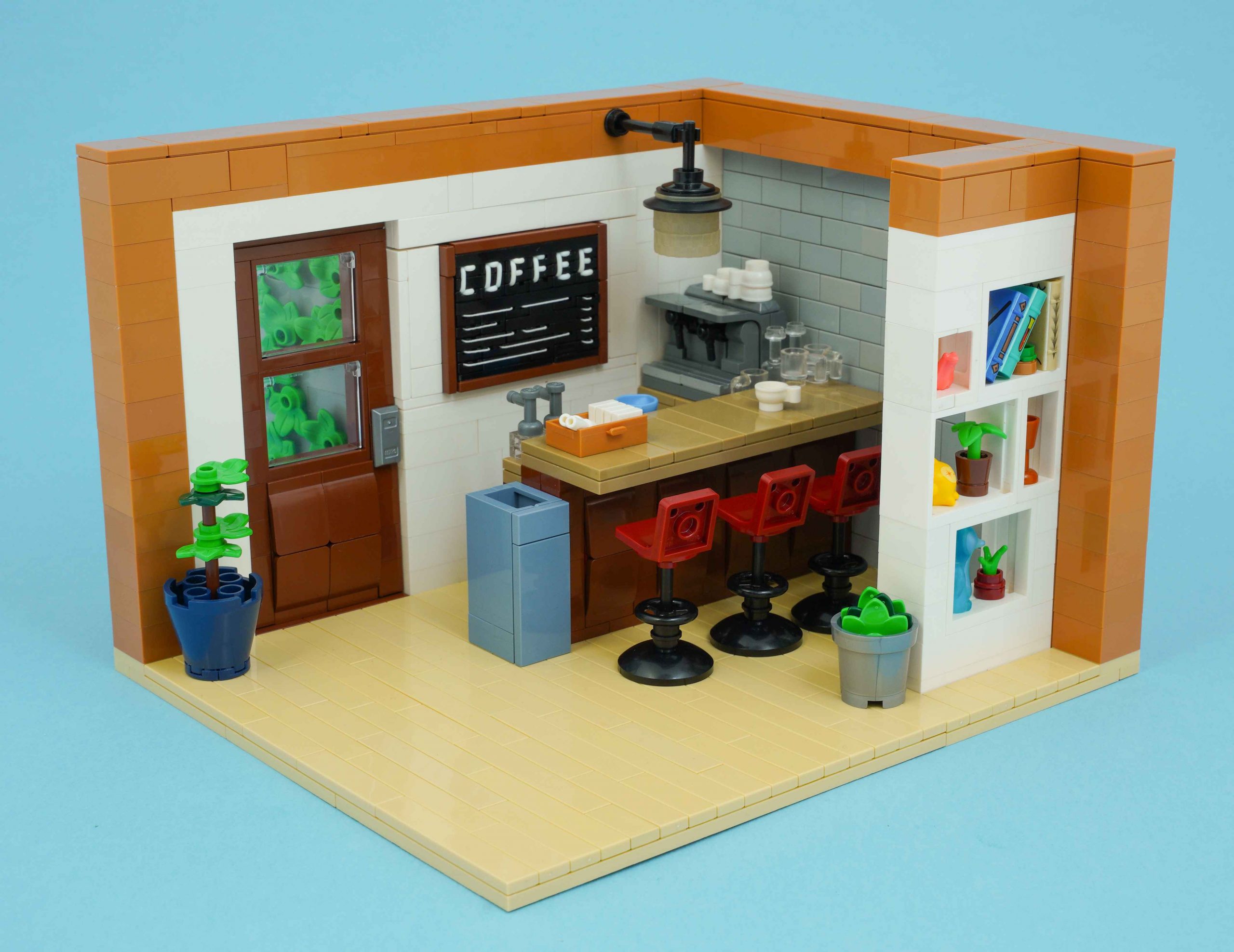 Grant Davis integrates the seed part in multiple ways into this elegant cafe scene. The obvious spot is for the diner stools that flip the chairs on their back, but chairs are also used for the espresso machine and door panel. The biggest flex of all, however, is the sign which uses LEGO rubber bands and string to form the lettering and lines.