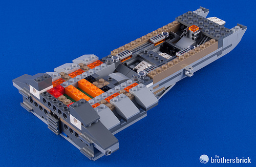 The cooling fins look terrific. They’re constructed as two sub-assemblies, with each attaching via a pair of Technic pins. Here you can also see the lower air brakes on either side of the cooling fins.