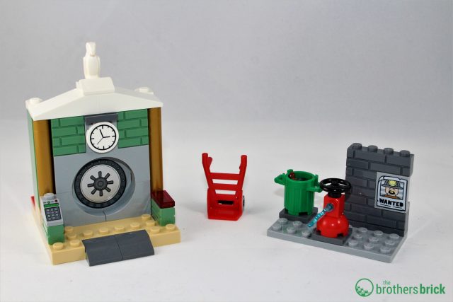 Bag three of this set contains all the parts for the bank vault, as well as a little fire-hydrant street scene complete with gold, money, and garbage (soda can and stick). Again, symmetry made this one pretty quick. Interestingly, there is a red dolly that has plenty of playability potential that isn’t displayed very well on the box-art.