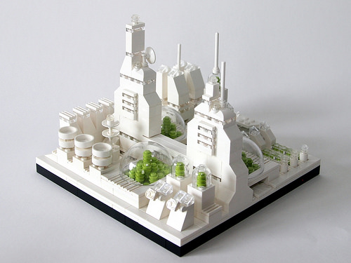 The shining white utopian future — so popular with the science fiction writers and illustrators of the 1960s — may well have gone out of fashion, but this hasn’t stopped builder Klaus exploring the theme. Built in microscale, his series of architectural models of a future metropolis use predominately standard bricks, similar to those found in 21050 Studio set, in smart repetitive sequences. The bustling administration complex adds stacked mudguard elements to build its towers, whilst a cigarillo shaped blimp circles overhead.
