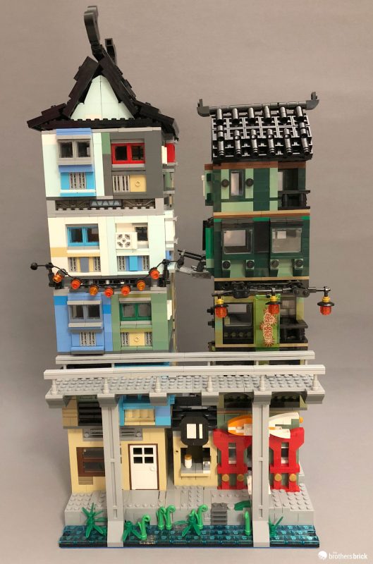 The visual style of Ninjago City, as portrayed in the official sets and the movie, is of a vertically stacked city that’s an eclectic blend of traditional and modern architecture. The lower levels of the city are a bit run-down, or simply older, wood construction. Earth tones and simple, de-saturated colors, worn sidewalks, and plenty of vegetation set the scene. As we work our way up to the second level (there are generally two floors or stories for each level) the city is cleaner and newer, with brighter colors and plenty of shops and advertising. The third level, which not every block needs to have, can continue the aesthetic of the second level, or start to shift towards a more futuristic vibe.