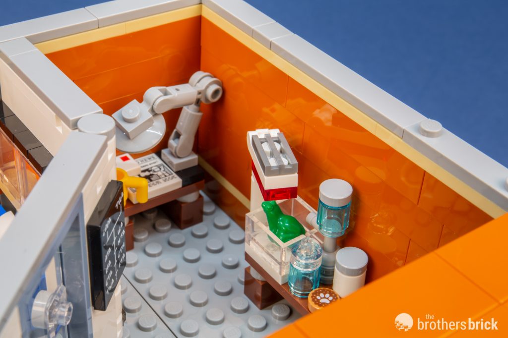 When complete, the second floor has a waiting area for animal patients and their owners, as well as an examination room with a variety of equipment. Notice how the LEGO designers have used 1×1 round tiles as well as corner wedge tiles to accommodate the off-grid construction of the walls.