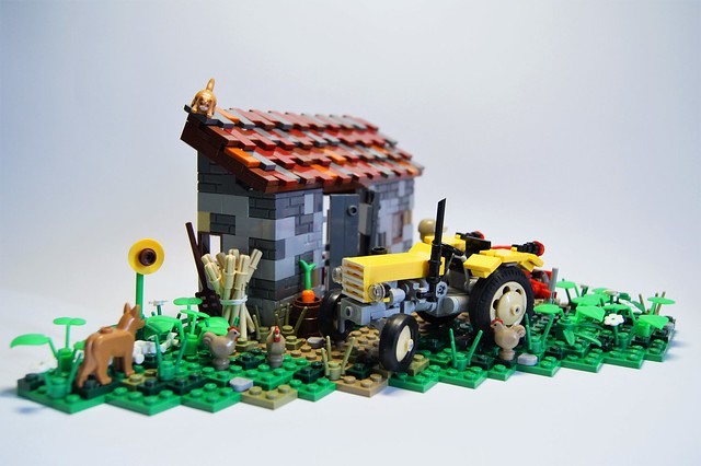 This tranquil LEGO scene from Damian Z. is a great way to highlight the real star, the tractor. The Polish Ursus C330 is a wonderful piece of work with lots of detail despite its small minifigure-scale size. A handful of common clips and other bits stand in for the engine details, while Technic pulley wheels work as the hubs to make tractor-like tires out of larger-scale racing tires.
