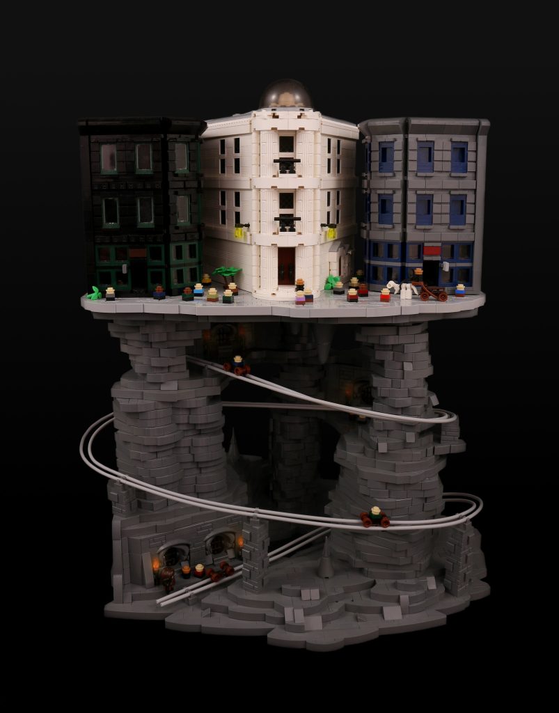 The rock pillars beneath the street are impressive, built in sideways rings and then threaded onto Technic axles, allowing them to spin around into different configurations. This is great, because it means that you can build the same shape a bunch of times and have it look different depending on how it is angled. The cars down on the tracks are delightfully simple, consisting of droid arms and round 1×1 tiles with bar and pin holders. The cart up on the street above-ground is also inspired, making brilliant use of wands on sprue to give delicate texture to the rails. It’s also being pulled by something skeletal (a thestral, perhaps?). This was originally built for our own Harry Potter Microscale Magic competition, but Eli failed to complete the photography in time. While that is too bad, it is certainly better late than never!