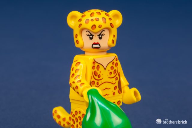 The series second villain is up next, with super-villain and Wonder Woman nemesis Cheetah. Based on the original costume from the early Wonder Woman comics, Cheetah is covered head-to-toe in camouflage spots. Her helmet with small rounded ears is a new element, though it’s sure to see use again in other animal costumes. Cheetah’s hot a soft rubber tail that’s also printed with spots, and she carries a green money bag that’s perfect for stereotypical bank heists everywhere. Cheetah’s head is double-sided with an alternate expression of ferocious anger.