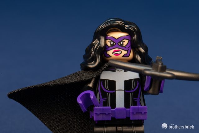 Another new entry to the LEGO superhero pantheon, this version of Huntress is Helena Wayne, the daughter of Batman and Catwoman, with a costume hailing from the New 52 series starting in 2012. She’s equipped with a standard LEGO crossbow in pearl dark grey, a common color for it, and has a one-hole cape made of soft fabric like Batman and Superman’s capes. Her hair is the mid-length wavy hairpiece that’s been used on a variety of figures before such as Hermoine and Wonder Woman, but appears here in black for the first time. She also has a purple utility belt, which is not a new color for it. Huntress’ masked face is printed on both sides, with alternate smiling and angry expressions. The sides of the legs are not printed, though the upper arms each have purple pauldrons printed on. The torso back is printed with costume lines.