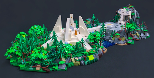 After writing about LEGO for nearly a decade, it’s rare that I see a mashup that’s new, let alone one that’s done excellently. But this build by Mansur Soeleman brought me that rare delight in the form of a Bionicle creation made of system pieces and done in microscale. The lush green island is Kini Nui, the temple at the heart of Mata Nui in the Bionicle universe, and it evokes the verdant foliage of the island’s jungle well. The build is loaded with brand new elements which I’m excited to see put to such great use, such as the white 1x8x3 slopes for the four pillars on the temple.