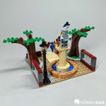 Book five adds a bit of family fun to the Main Square. This scene has a four-minifigure family celebrating in the park. There are flags strung between the lampposts, a table of food and presents. In the background there’s a fountain with a statue. The statue is of a handcuffed person in an archer’s cap standing over a sword…I’m not sure what the story is there, but it certainly adds a bit of atmosphere to the scene.