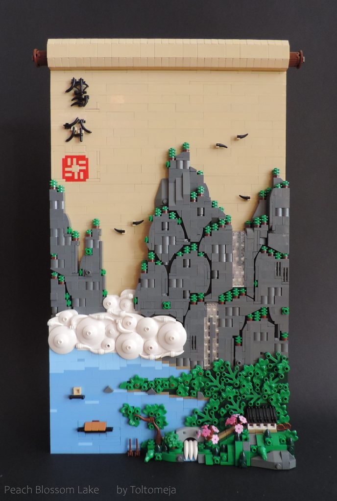 When it comes to building with LEGO our creations tend to 3D most of the time. Toltomeja chose to go for a 2D approach with their latest creation. My knowledge about Chinese culture and art is not that strong, so if I use the wrong wording, please excuse me. Toltomeja made a scroll with a decorative landscape painting in Chinese calligraphy style. The artwork is filled with little details and parts used in a very smart way. For instance, there are sausages, horns, a sextant and a t-bar used in Chinese characters.