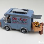 First up is a quick vehicle build. The OH-KAY Plumbing & Heating truck is a reasonably faithful reproduction of the movie van, although it lacks any doors on the sides. The logos are sticker-based, which, as you can see, I can never quite align perfectly. The van has a removable roof rack with pipes, an opening rear door, and a bench-seat built for two. There’s also a removable box of golden loot (a trophy and a kitchen faucet) to add a bit of story value.