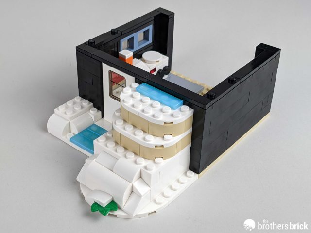 A simple removable roof completes this building add-on. The large white Technic connector on the kitchen level is part of a play feature we’ll cover in a bit.