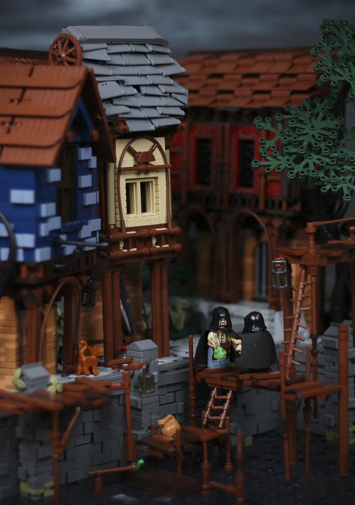 The first in a trio of LEGO creations from different builders, this nefarious deal for a poisonous potion is brought to us by Eli Willsea. The wooden beams and boards creating the patchwork docks on which the vial of poison is exchanged are absolutely terrific. There’s some excellent use of the minifig hand to create ladder rungs, and just enough chaos in the various bar part choices to give that ramshackle feel. But the highlight of the build for me lies in the houses in the background. The color choices are perfect, and perfectly compliment the brown skeleton on which they’re all built. And those roof tiles! Each utilizing a different type of hinged panel (large entry door, kitchen cabinet door, or book cover), they are an absolute marvel to behold! The varied look between the domiciles shows off Eli’s design prowess while feeding that feel that this is the wrong side of town.