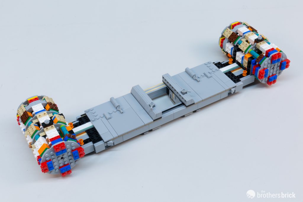 In any case, it’s not that the Razor Crest is first UCS set to be minifigure scale—both the 75192 UCS Millenium Falcon and 75313 UCS AT-AT were roughly minifigure scale. But both the Falcon is so huge as to be a logistics nightmare to move, relegating it to a table prop rather than a functional vehicle toy. And the AT-AT on its spindly legs suffers much the same fate. The Razor Crest, on the other hand, is quite easy to move around, albeit carefully. The manual includes guidance on how to move it, though unlike some other UCS models (looking at you, AT-AT), I found in practice the model is quite robust and actually needs even less careful handling than the instructions indicate. What you cannot do, though, is make the instinctive move of lifting the model by its armpits, which is to say, beneath the wings. If you do, you won’t damage anything, but you’ll lift the engines and leave the ship behind!