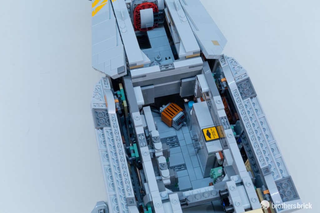 Up top, the escape pod is very similar to the one on the smaller 1,000-piece model, but it fits in much better here. It has an opening lid and room for one minifigure.