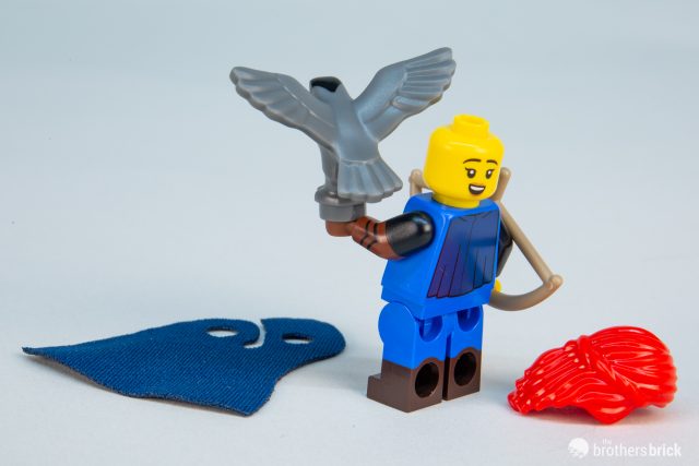 The orc’s battered cape is a new design made of the same thicker, softer fabric as the Falconer’s cape. The orc’s head is single-sided, but the front is fully printed despite being mostly covered by the chin piece. An extra brown 1×1 for the ponytail is included.