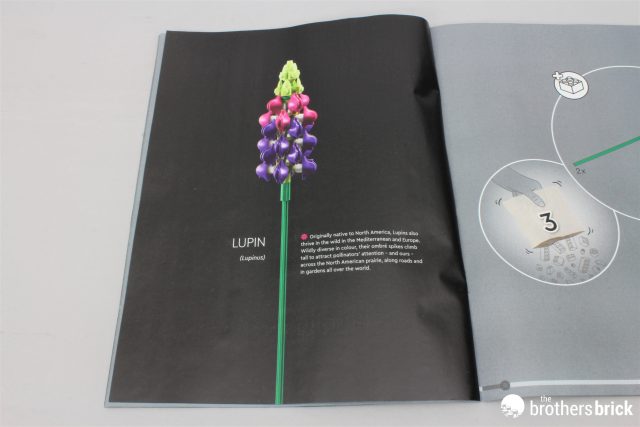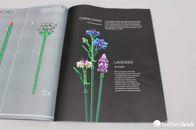 Although the instructions are something you really don’t look at past building the model, it’s nice when they have substance. The cover of this one, for example, isn’t just the same image as the front of the box. Instead, it’s an artistic departure. More interesting though, is what you learn from the book. These flowers were not arbitrarily chosen. Instead, they are representatives from various locations around the globe. The symbolism of that is a nice touch. I’m also a fan of the fact that each flower is presented with its name, which has been lacking in other models from the collection.