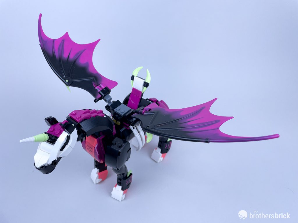 Great villains need personal transportation, and 71457 Pegasus Flying Horse supplies the Nightmare King with his personal steed in a handsome black with a magenta mane and tail and coral and white highlights. Read on for our review of the set, which contains 482 pieces, 3 minifigures, and a Grimspawn, which can be pre-ordered now and will ship August 1st for US $49.99 | CAN $64.99 | UK £46.99.