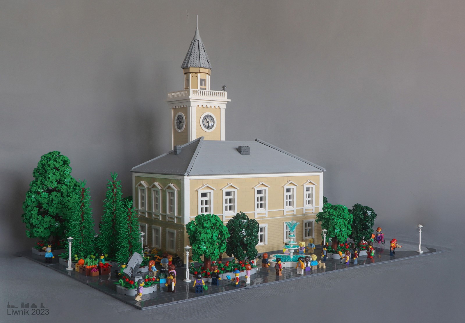 Taking a look at the back of the hall, Lukasz has also included a fountain, sculpture garden, and produce vendor looking to sell his wares. And all of the other minifigures look so busy in their various poses throughout the scene. I hope I get to see more of LUGPOL’s town layout soon!
