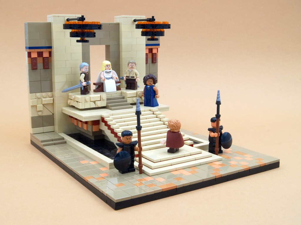 With Targaryens and their dragons once again fighting to control the Iron Throne (and Sunday night TV), what better time than to revisit the Breaker of Chains? Martin Studio recreates the Meereen Throne Room, where Daenerys ruled for 3 seasons before marching on Westeros. This was done as an entry into the Summer Joust “Stairway Tales” category. And what a grand staircase it is, filled with details to match the look of the location from Game of Thrones. While keeping to the original’s muted color palette, Martin brings out a little more contrast to great effect. I love how the dark red and orange show through the seams between white tiles on the stairway, recreating the mortar on the screen version. And the mix of outward-facing tiles, plates, and ingots recreate the engraved landing beneath the throne. The choice of minifig parts to recreate Missandei, Jorah, and the rest is spot on. It’s an exquisite remake of an iconic location, and just a great set of stairs.