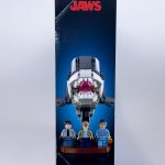 The box follows a familiar format for 18+ Ideas and Icons sets, with the Jaws logo and the diorama version of the build shown on the full front cover, and the separate full shark-on-a-stand, how the shark transitions between diorama base and stand, and some inset detail panels on the back. One of the box sides also shows how the shark stand can display the 3 included minifigures – check out the gallery at the end of our review to see that and many more additional photos.