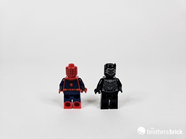 Next up, we’ll have a gander at Spider-Man and Black Panther. The web-head’s torso is the same as the one from 76218 Sanctum Sanctorum, with printed arms and front-and back printing. However, the legs are far less detailed, and simply a dual-mold of red and dark blue. King T’challa, with claws at the ready, sports a new suit as well. It’s also printed on the front and back of the head and torso.
