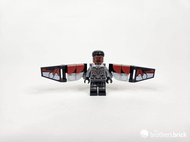 Finally, we come to the most-equipped minifigure: Falcon. The minifigure here is completely identical to the one used in 76269 Avengers Tower. The only thing unique is the design of the wings, trading some of the stickers for tiles in this version. Be sure to check out the cute Redwing on the back of his pack in the form of a stickered dark red triangle tile.