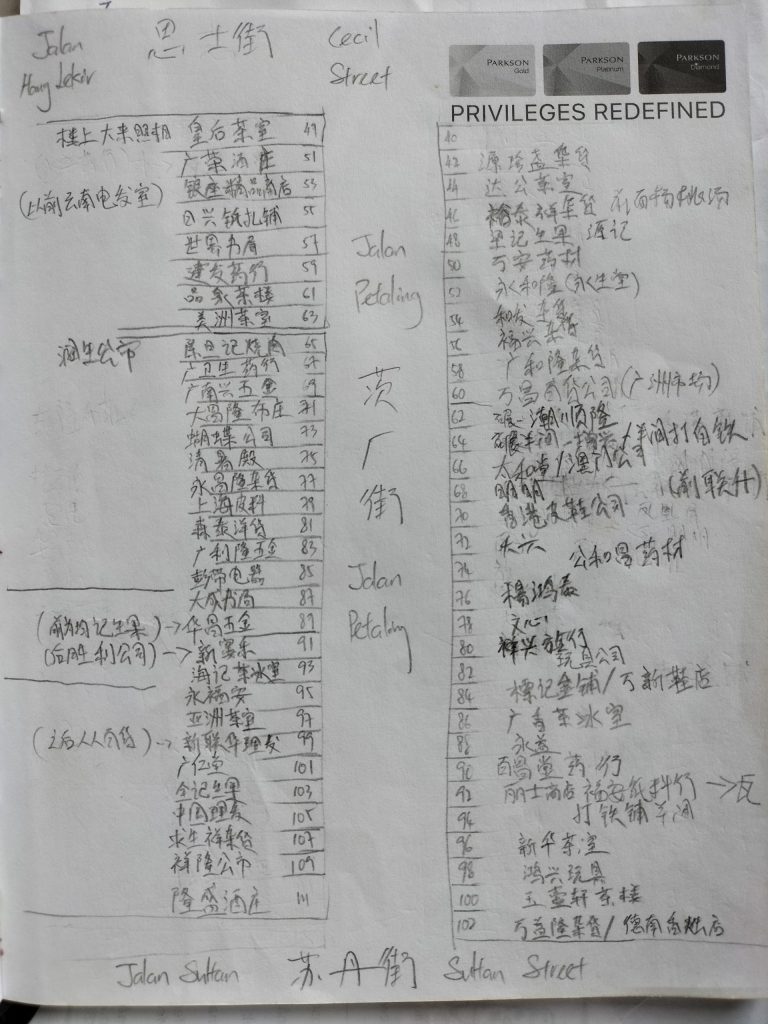 “For example, there was Brother Weng who sold steamed buns in the alley. He used to live at No. 46 Petaling Street. He drew the floor plan of the upstairs and downstairs where he lived, letting me know that the downstairs was a grocery store and that there were seventeen rooms upstairs. He also very enthusiastically asked everyone he knew to help me think of the name of each old store to help me complete the work.”