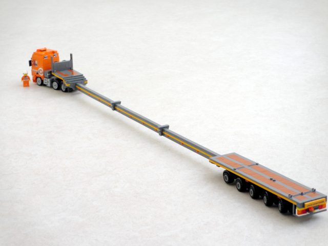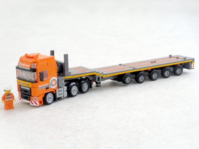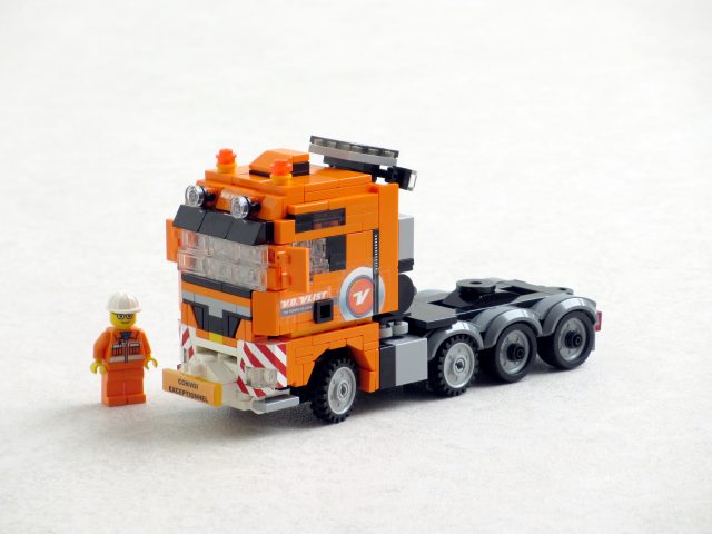 The tractor is a German-built MAN TGX in the orange livery of Dutch heavy haulage firm Van der Vlist. This is essentially a copy of the train truckers tractor from earlier this year, in a different colour and with a few different details. When I built this, in the summer, I had no intention of building a trailer for it. I lent the Volvo that pulls the mega windmill trailer to a friend and simply wanted a suitable tractor to replace it on my display shelves. Since Van der Vlist also uses MANs for this task and I had the parts I needed to build one, building one made sense.
