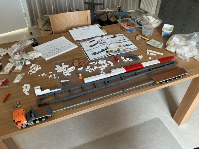When I built my Lego mega windmill trailer, for carrying a wind turbine nacelle, I did not think this would be the start of a trilogy. However, I subsequently built a truck that carries a rotor hub. At that point, it was pretty much inevitable that I would also build a vehicle carrying one of the blades.