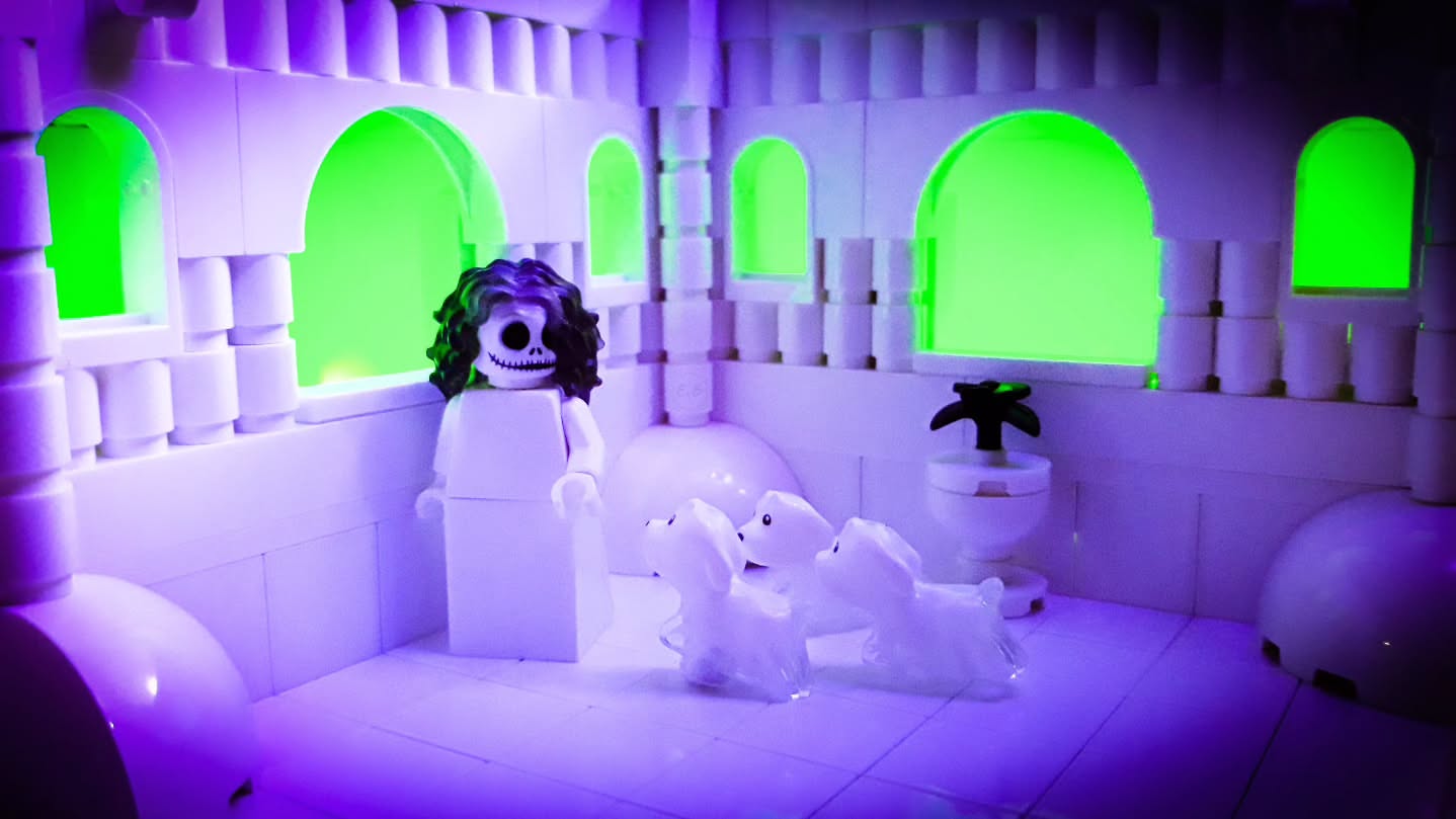 e.b_brixx provides no explanation for this eerie scene, but I love it. The all-white room, spectral dogs and Jack Skellington with a wig lit by neon green light feel like they’re pulled from a forgotten cult-classic animated film.