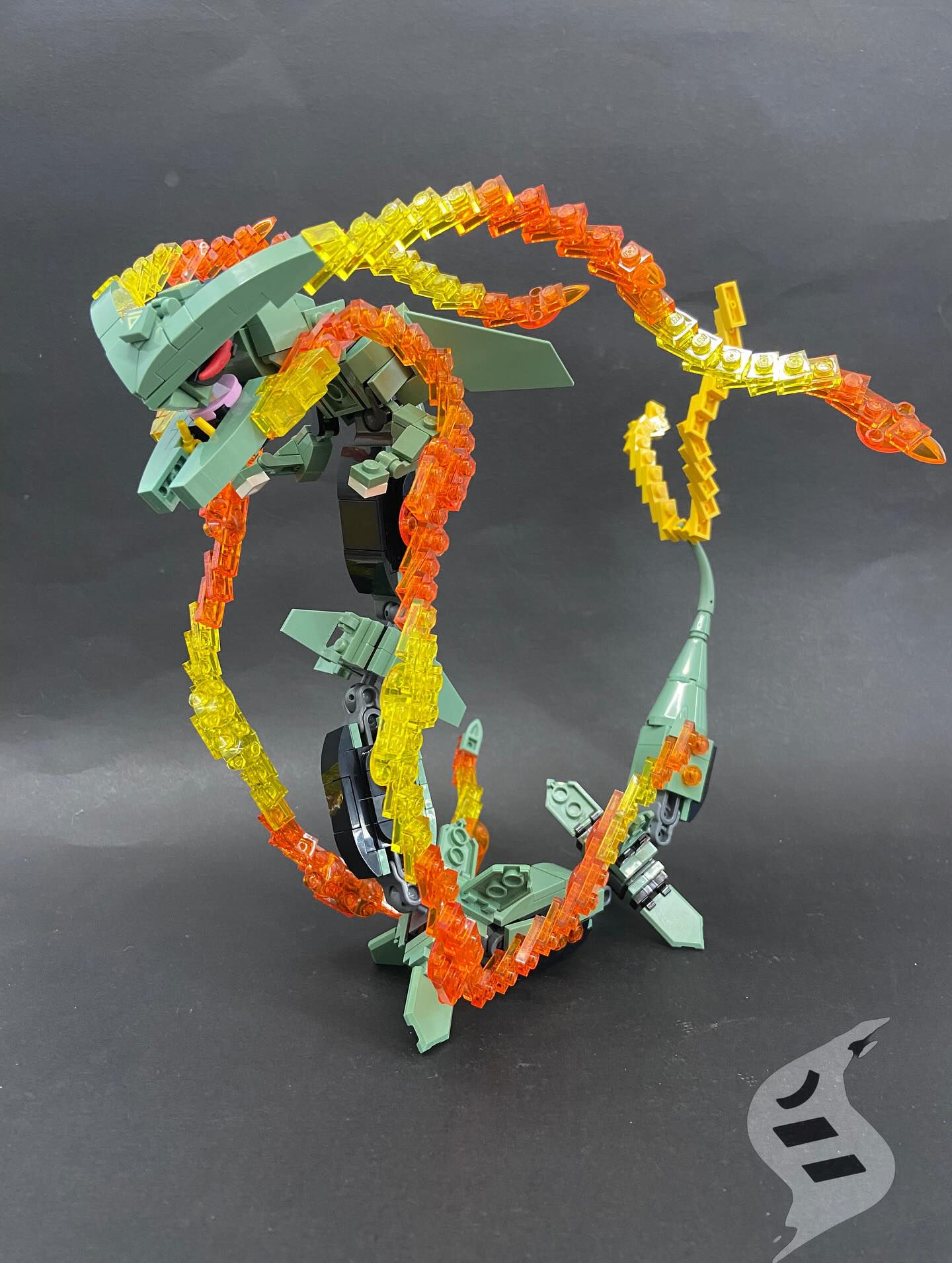 @awesome_mocs takes on the challenge of building Mega Rayquaza, a snake-like dragon whose mega form adds filagree tendrils to its horns and tail, delicately constructed here from stacked plates.