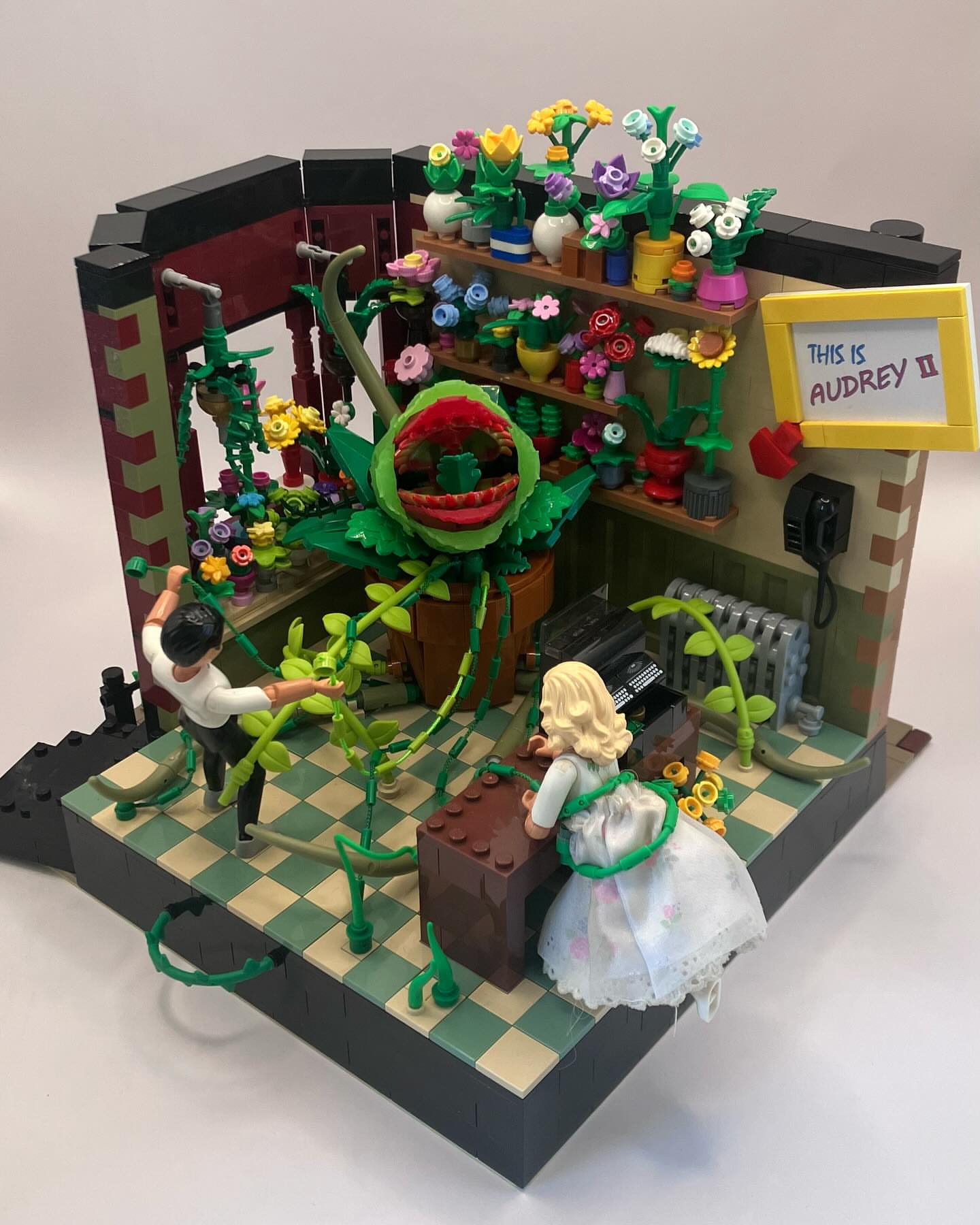 LEGO’s Belville dolls are such strange and wonderful creations – a product of the late ’90s that looks like they came from a much earlier decade – which is probably why the dolls work so well in the amazing nostalgia-steeped dioramas of Victoria Worsley. They’re especially perfect in Victoria’s homage to ’60s set Little Shop of Horrors where she depicts the climactic confrontation as Seymore suddenly stands up to the alien plant. The larger scale allows ample space for potted plants, and of course, the diva plant herself, Audrey II. Hero Factory cocoon shells work perfectly for the petals around Audrey II’s mouth.