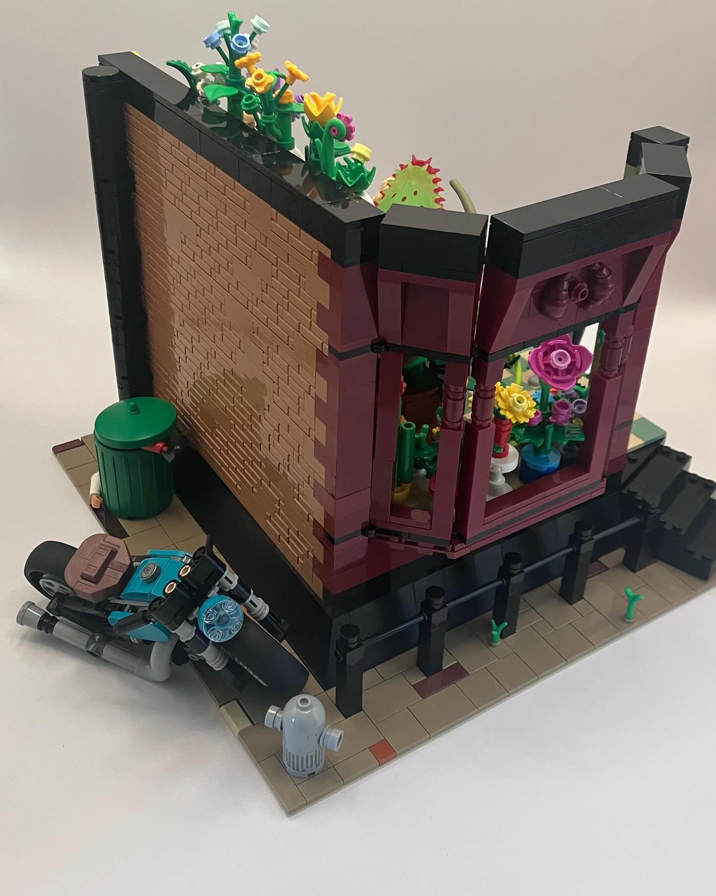 Flip the scene around and you can see what happened to demented dentist Orin Scrivello. His ride is the conveniently scaled Creator 3-in-1 Vintage Motorcycle. It’s great to see the Fabuland garbage bin is capable of holding severed limbs.