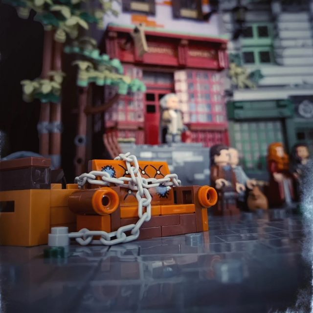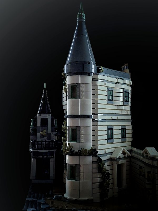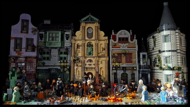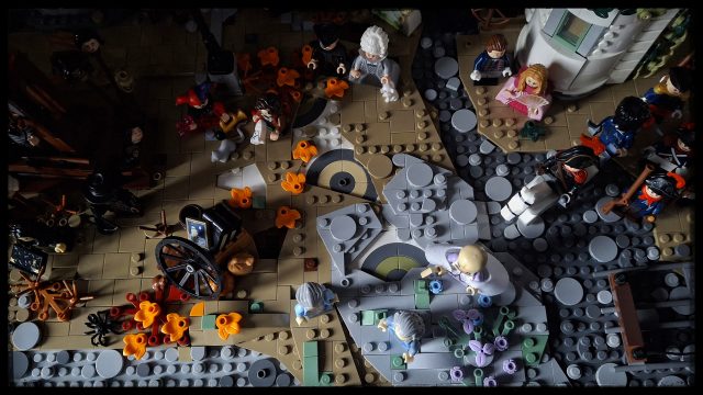 Alexander: The most useful LEGO series was definitely Harry Potter. To create the Plague Town I used three sets: Battle of Hogwarts, Gringotts Bank, and Diagon Alley. The facade of the bookstore from the Creator series fit perfectly into the model, and I reassembled it to give it a more wrecked look.