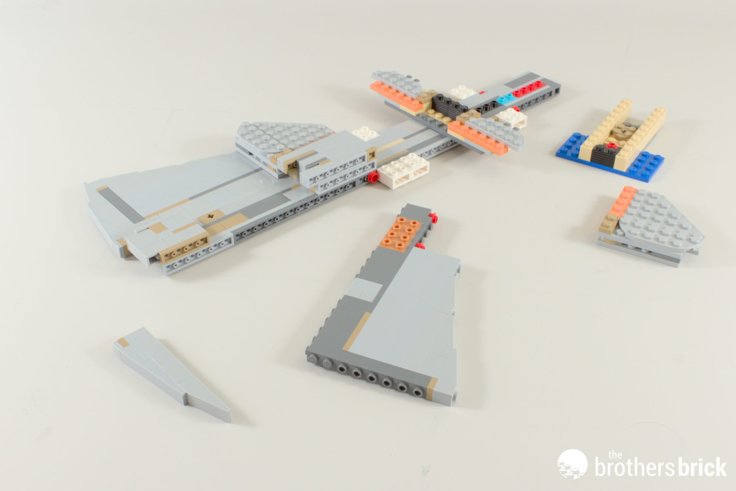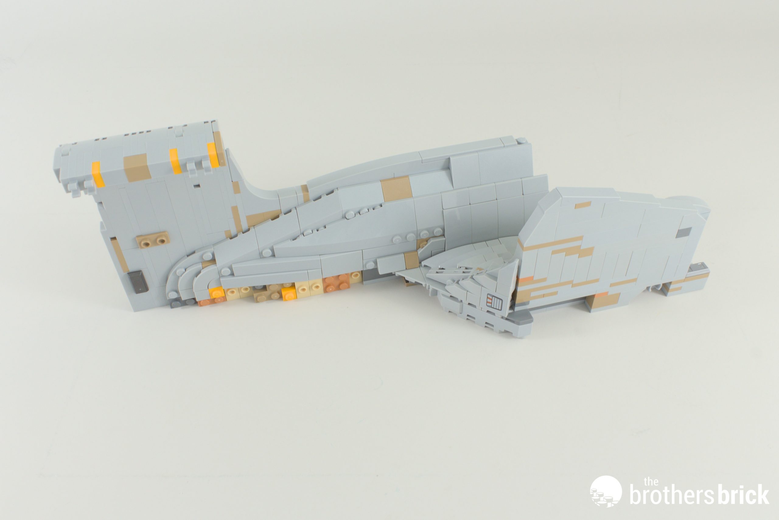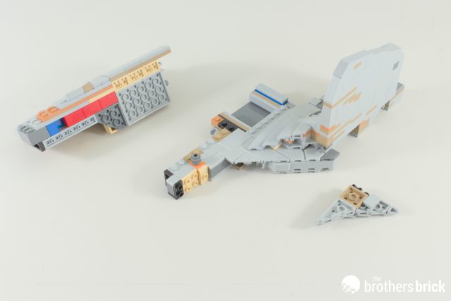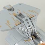 Eagle-eyed readers may have already sussed out the answer: a couple of Technic axles, and a trio of tow-ball joints! There are a few other tricks which we’ll come back to later to really shore it up, but these are the main structural components. Note also that the starboard shuttle bay sticker is, correctly, bigger than the port side.