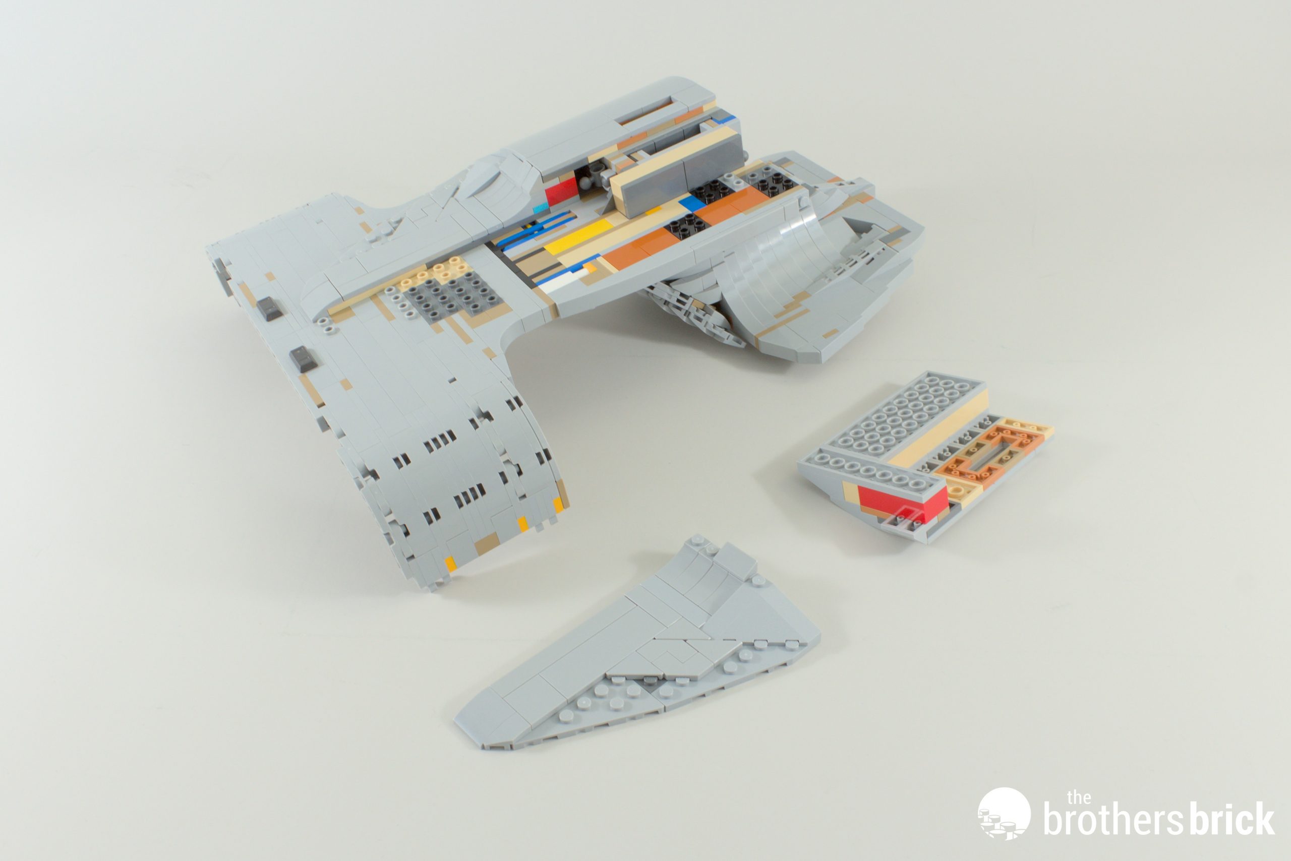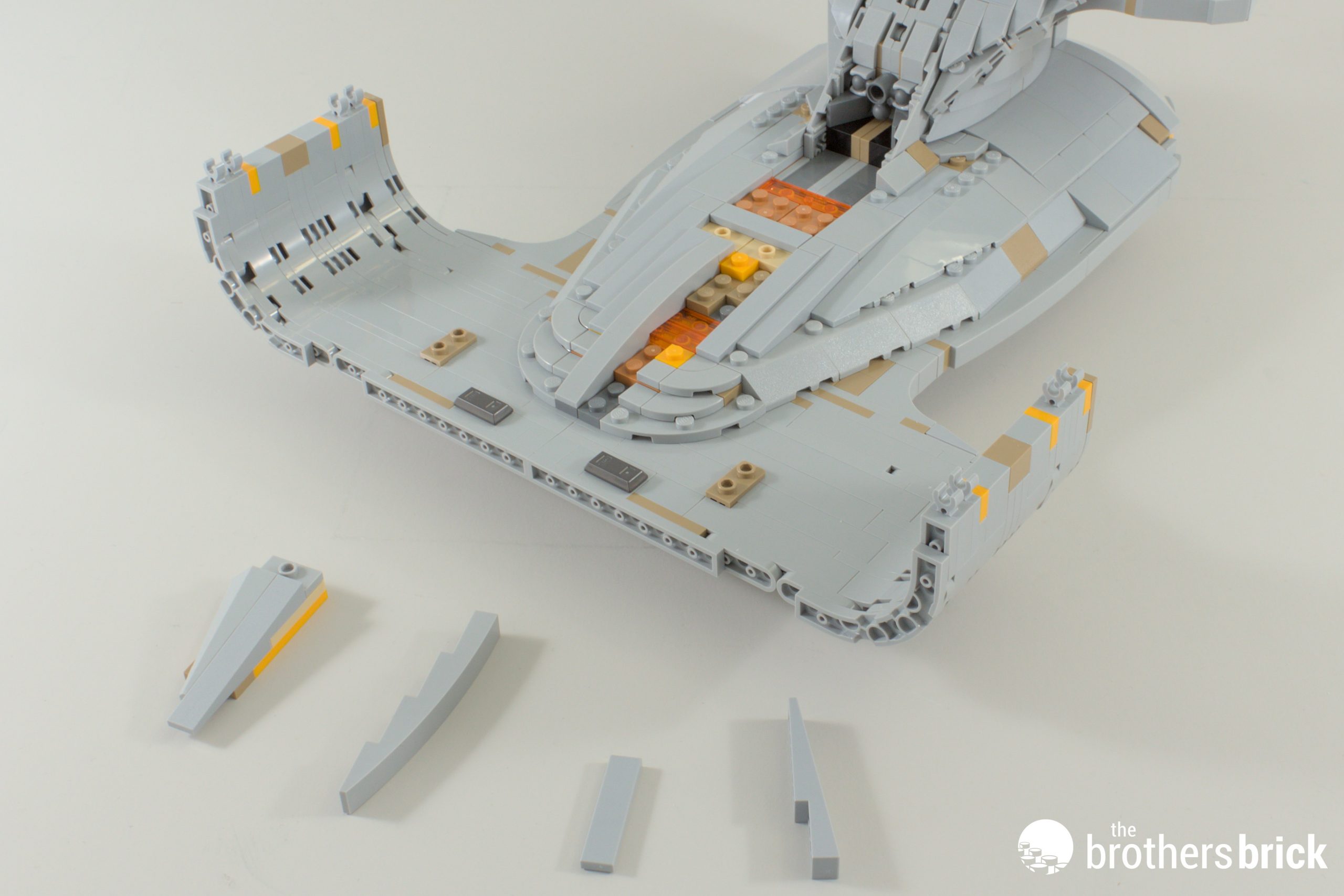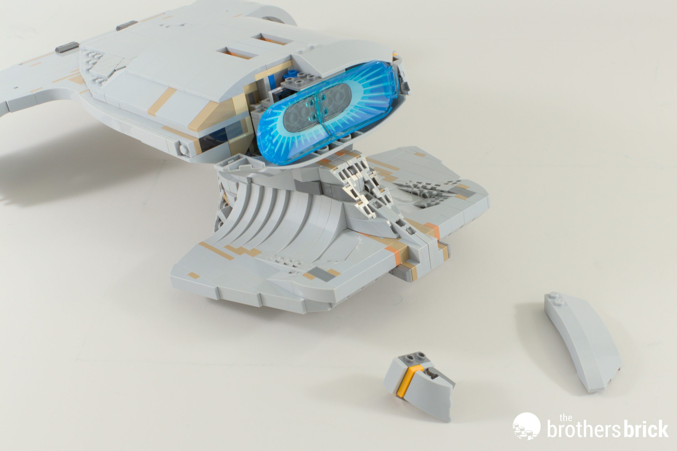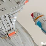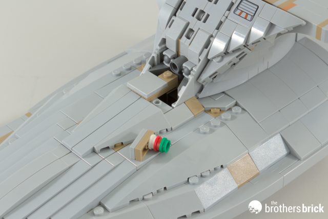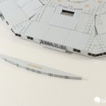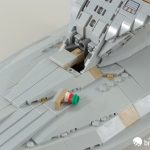 Right at the twilight of the build, we have a new element! This is a 1x10x5 curved slope, and it, like its smaller 1×8 counterpart, gets some printing for the Enterprise’s windows. The real thing is absolutely littered with windows, either lit up or not depending on how early on in the series you are. In this instance, having unlit windows was the best compromise for Crystal and the graphics team.