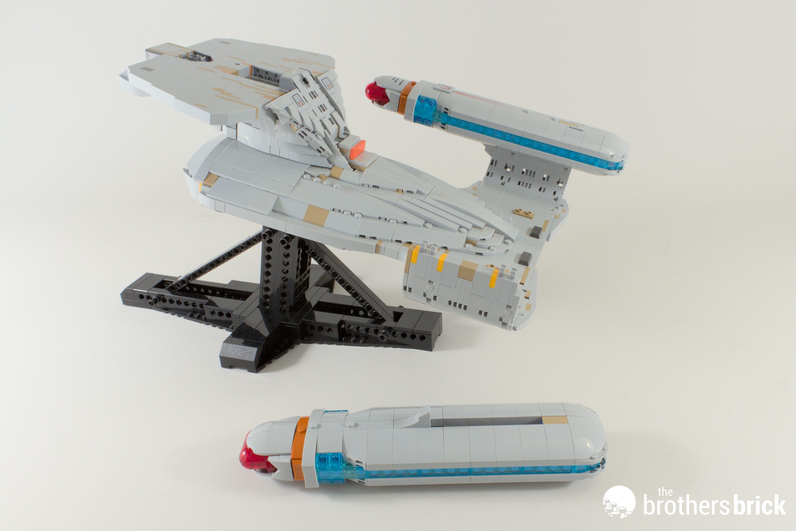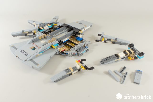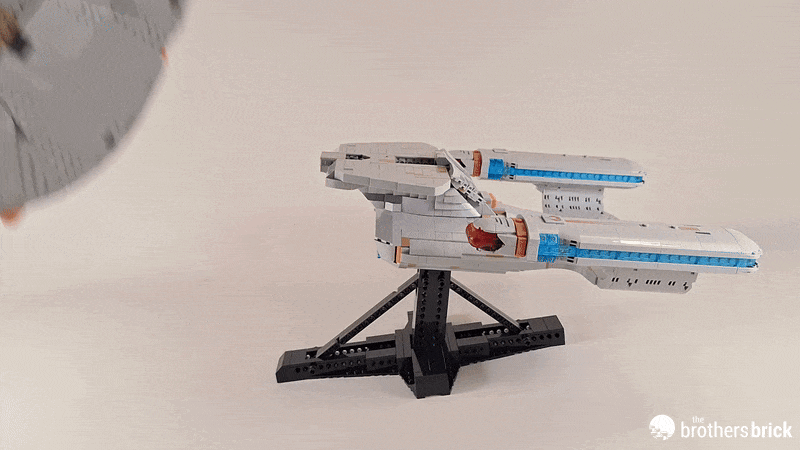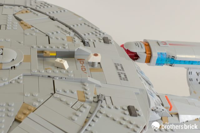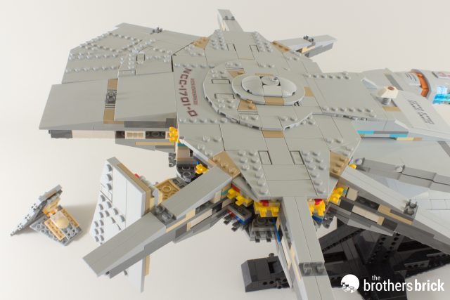 Speaking of shuttles, while I think the shuttlepod to lock in the dish is cute, it’s a shame that you essentially need to display the model with it flying in. Well, you could always shove a shorter Technic axle in there, but good luck getting it out to do this afterwards: