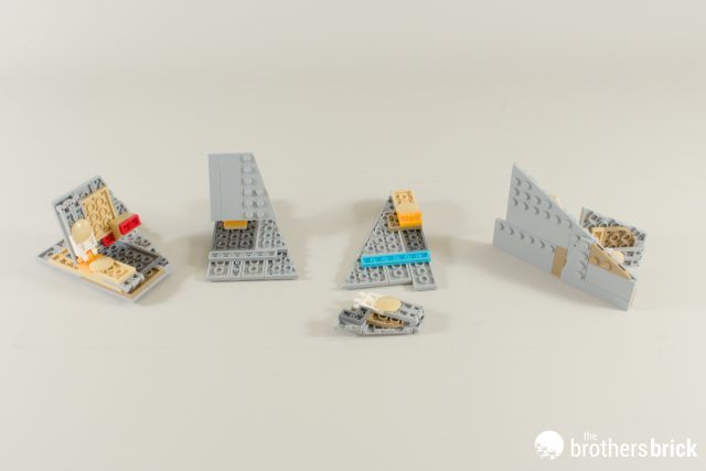 The gaps we’ve got will gradually be filled in by panels on hinges to create the ’round’ shape. It’s a technique that raised some eyebrows when this set turned up at TBB Towers, and judging by the roundtable discussion, we’re not the only ones to think that! According to Hans, it was clear pretty early on this flat panel idea would be the best one. The question was also asked if more segments than the 8 present had been considered, and the answer was yes – but here, the building experience won out. Building these was already repetitive enough; doing twice the amount of work would’ve been downright boring.