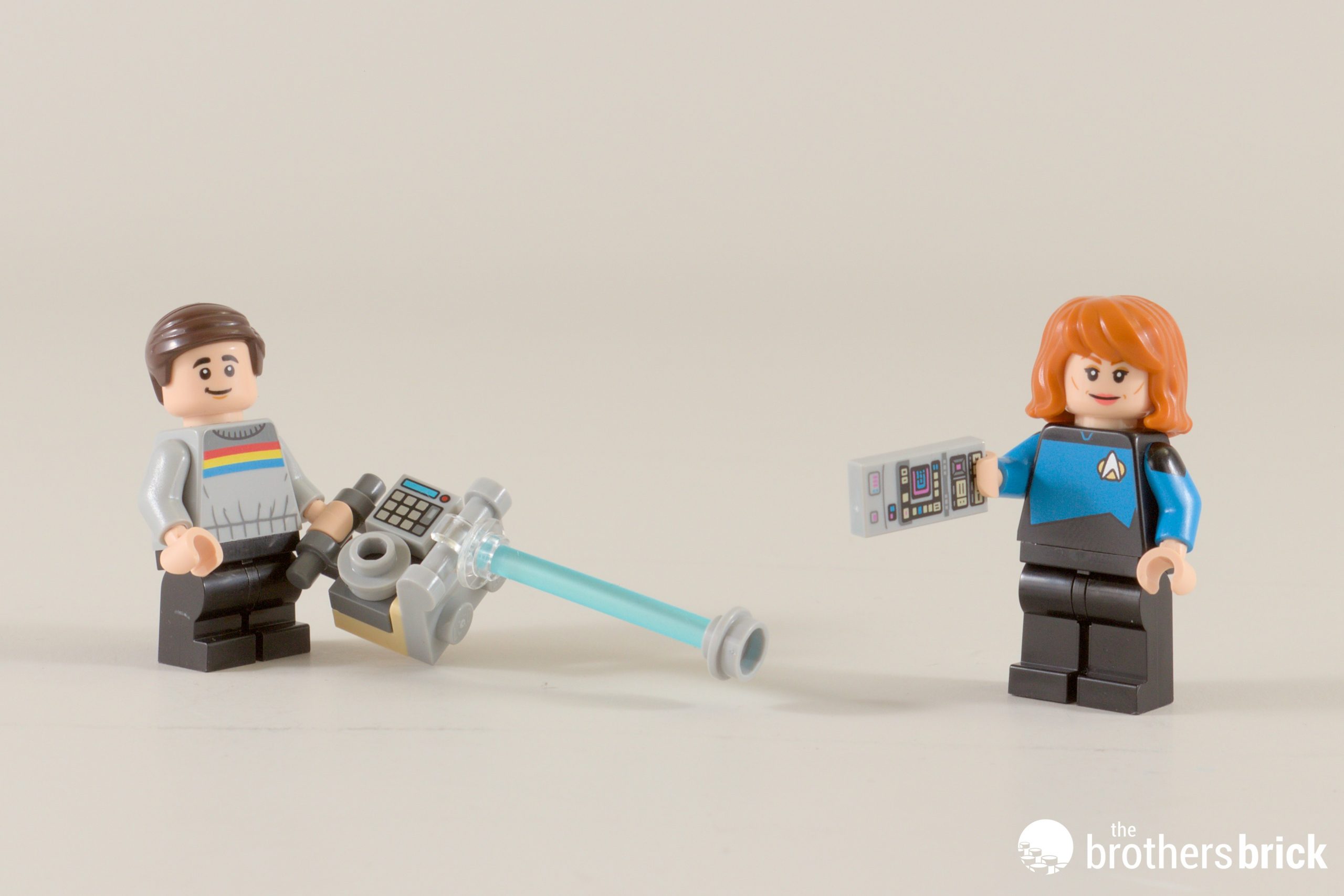 Let’s look at them more closely, starting with Deanna Troi (Marina Sirtis) and Ten Forward barkeep, Guinan (Whoopi Goldberg, of course). Deanna is probably the least convincing of the lot, but I do love her holopad analysis of a LEGO brick!