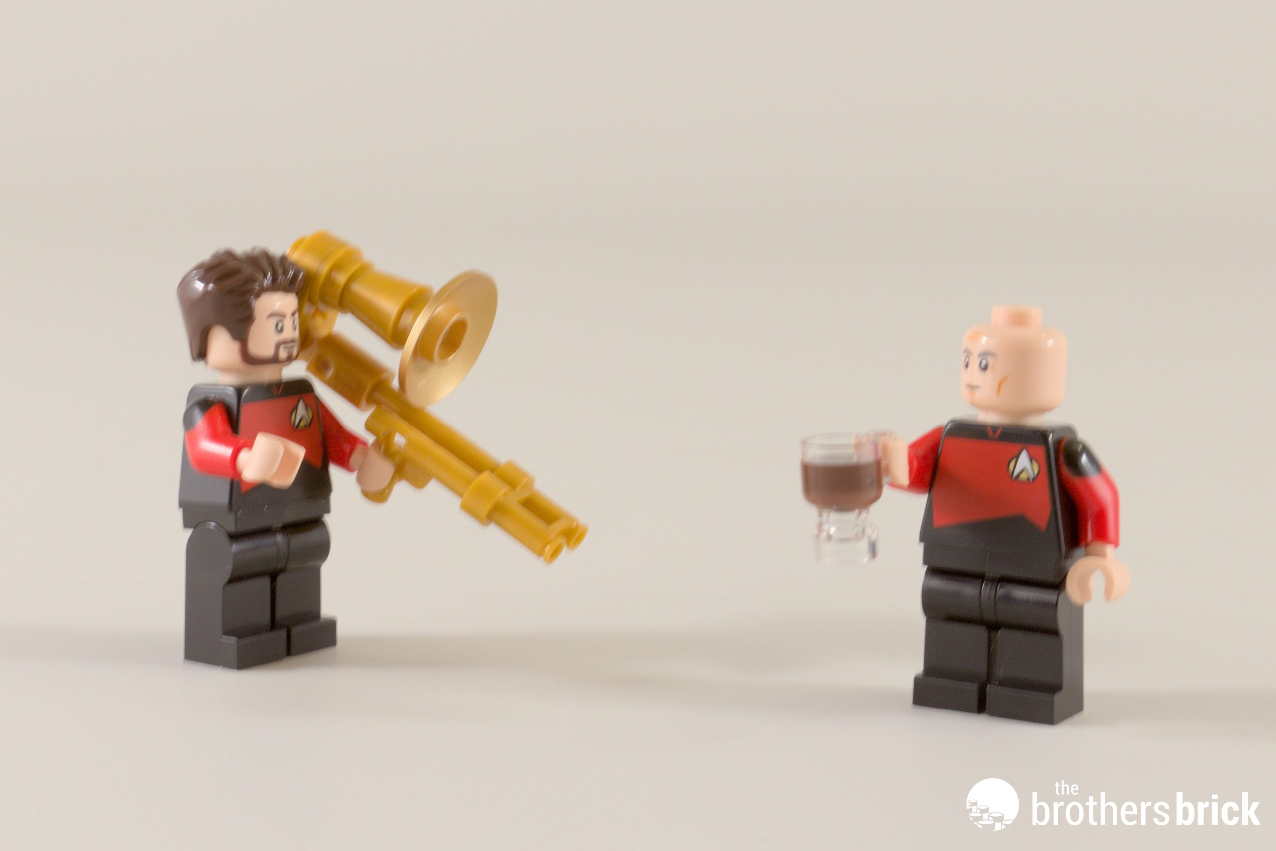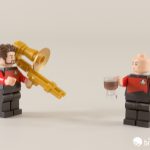 In Star Trek: the Original Series, the red shirts were engineering, and yellow was reserved for command. By the time of TNG, these had been reversed, so Captain Jean-Luc Picard and Commander William Riker – portrayed by Sir Patrick Stewart and Jonathan Frakes respectively – are at the top of the command chain here. Riker comes equipped with a marvelous brick-built jazz trombone, and he’s playing it so loud he rocked my camera. Dammit Riker!