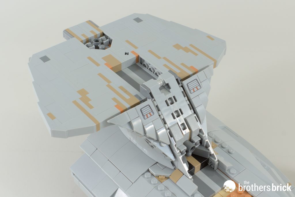 Speaking of shuttles, while I think the shuttlepod to lock in the dish is cute, it’s a shame that you essentially need to display the model with it flying in. Well, you could always shove a shorter Technic axle in there, but good luck getting it out to do this afterwards:
