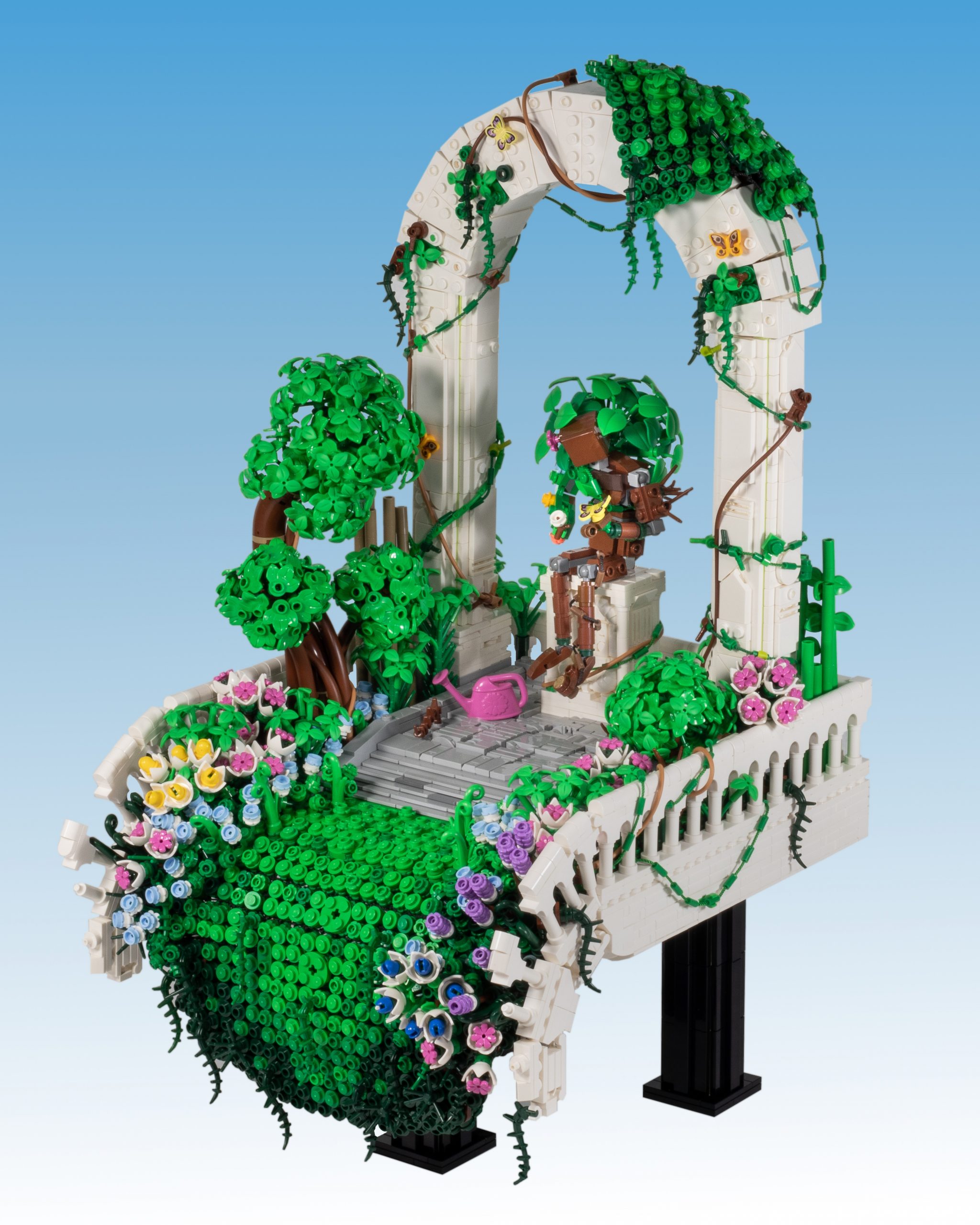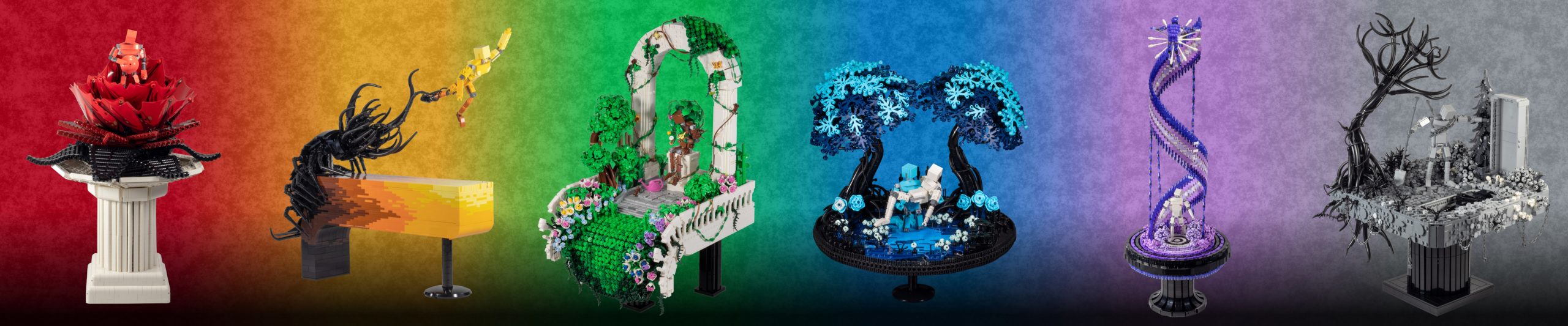 When arranged in ROYGBIV order, the six MOCs tell a loose narrative of: (RED) Birth, (YELLOW) Struggle, (GREEN) Serenity, (BLUE) Death, (PURPLE) Transcendence, and (BLACK) Aftermath (but at the risk of sounding pretentious, I prefer that viewers draw their own interpretations of each build – it’s more fun that way!). On the other hand, the actual build order was: BLUE, YELLOW, GREEN, RED, PURPLE, BLACK.