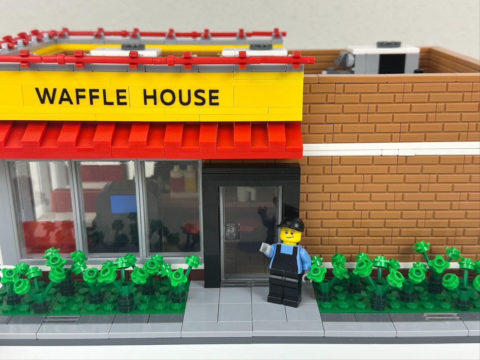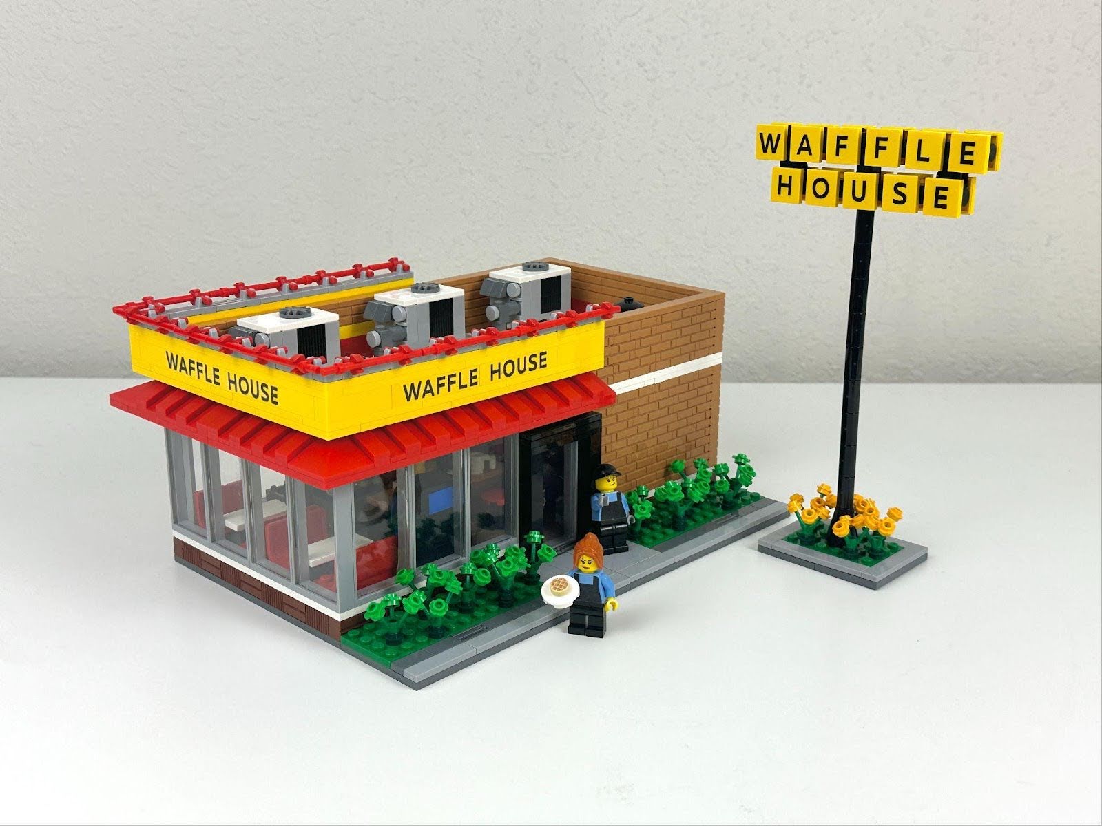 The sign is typical of a waffle house, yellow squares with huge black letters. I created custom waterslide decals for this (same type of decal you would see on airplane models) as well as the sign on the actual building itself. The main post in the sign is done using Technic friction pins and connectors as this would be way more rigid than a simple, brick-built one.