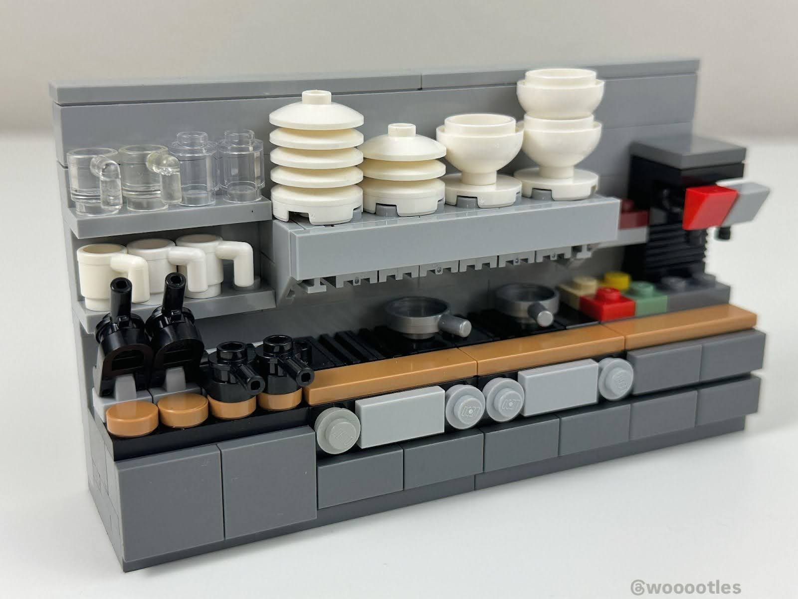 I started the interior with the kitchen. I’ve always been fascinated with and enjoy building kitchens, and this one is no different. With this, I have really studied what a Waffle House kitchen would look like, so I ended up with this—big flat top grill with large exhaust, plateware and glassware hanging up top, and waffle makers.