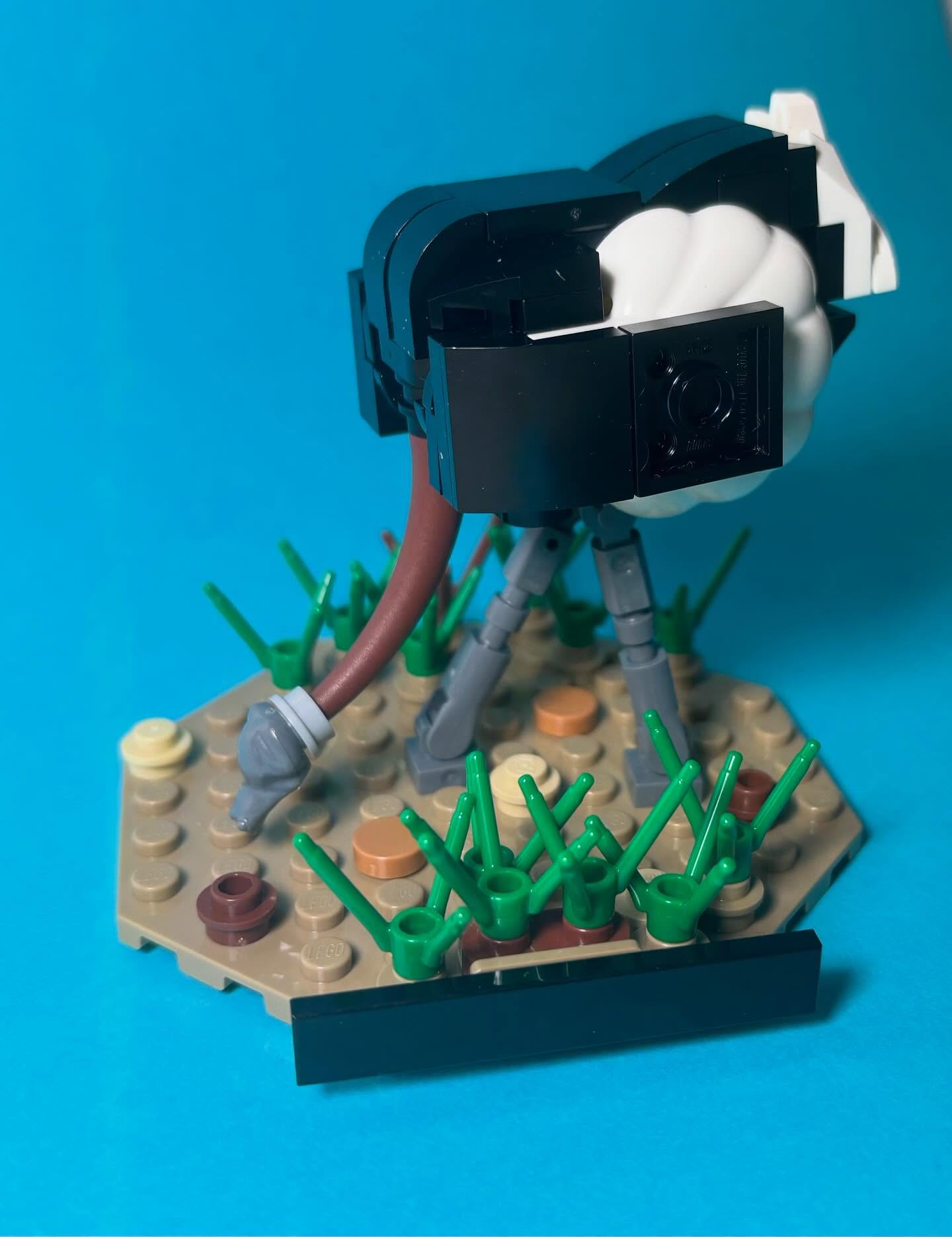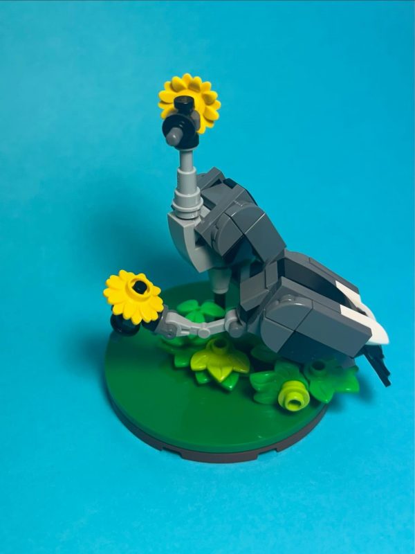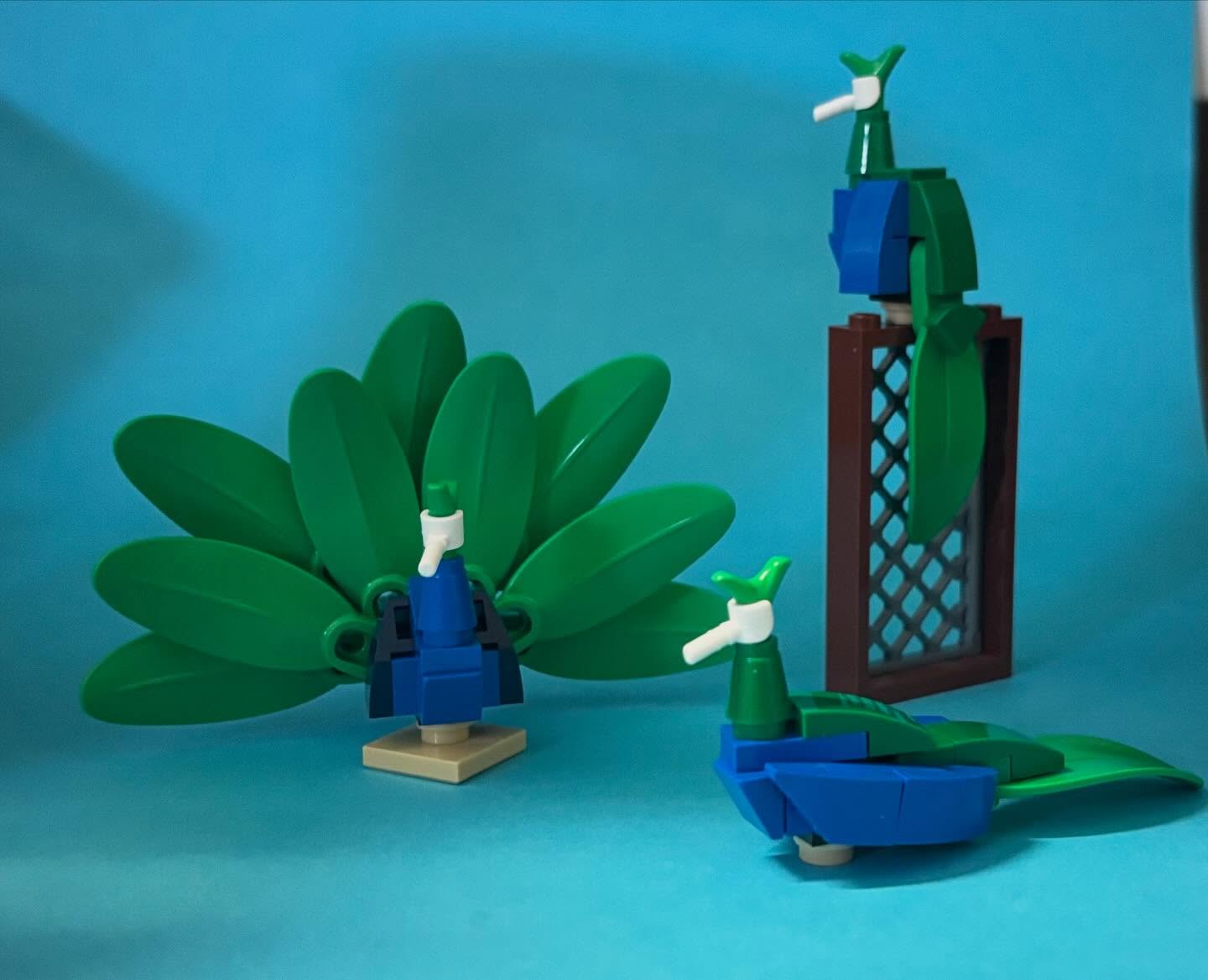 Peacocks flew in with several variations. A minifig hand clipped to a sprout is an inspired way to give the bird its signature crest. William also made custom stickers to give the tailfeathers “eyes” but I prefer these clean ones.