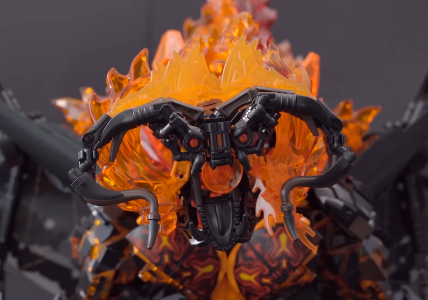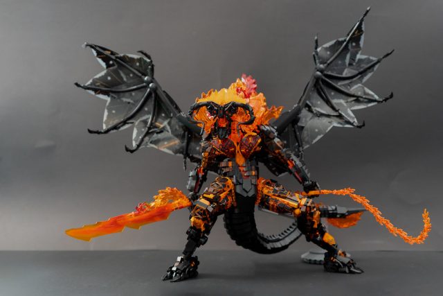 The impressively massive wings are comprised of a plethora of plastic glider wings from the old Ninja and Adventurers sets, there are translucent orange Hero Factory torsos hiding in the flames atop its back, and you might find more than one color of hot dog featured throughout the build. This is a Balrog build poised to strike fear into even the bravest of the Fellowship.