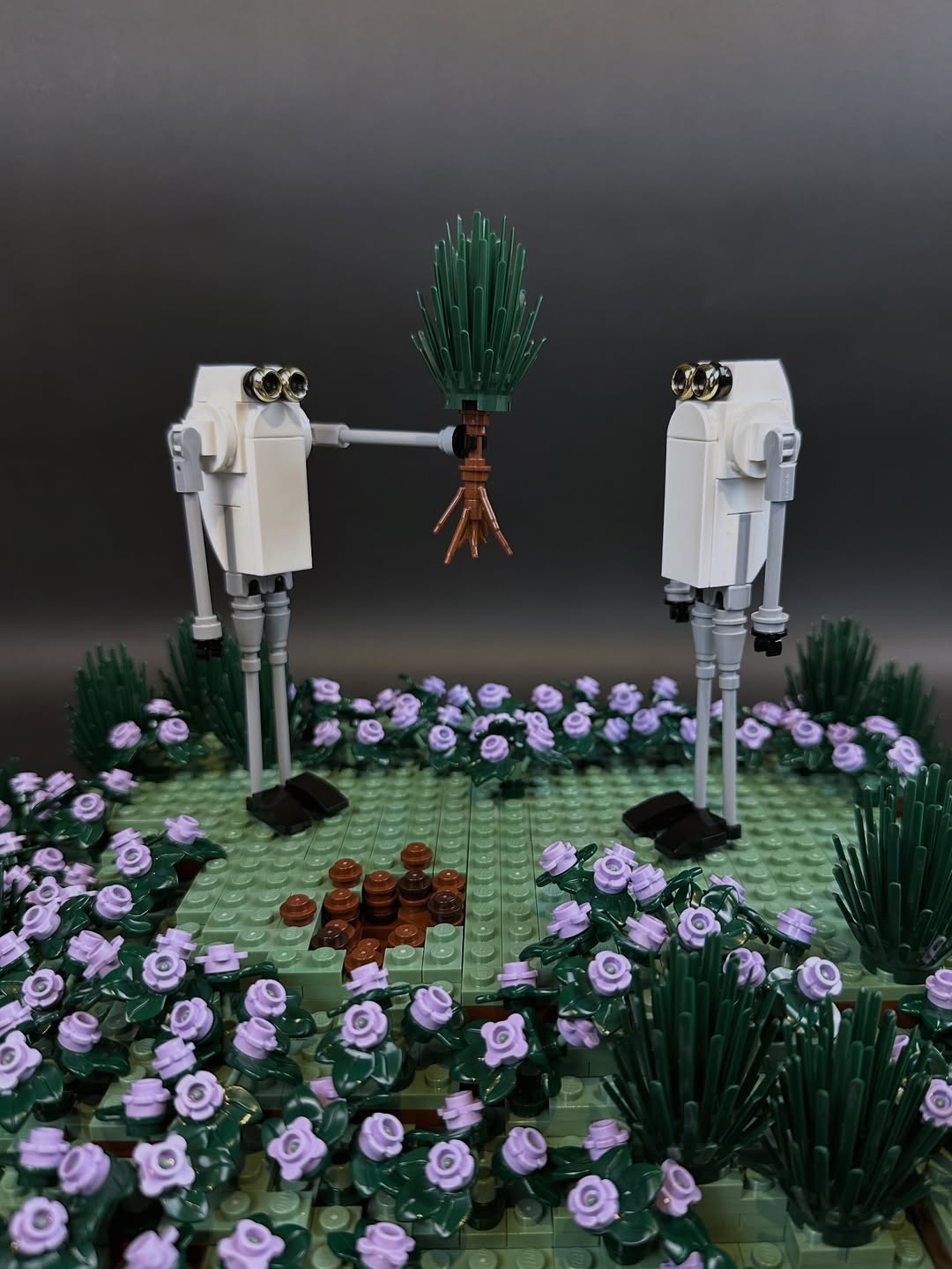 What is more romantic than an offering of plant matter? Clearly this robot suitor from Kelly Bartlett is well versed in human courtship rituals. Maybe you or I would have picked the purple flowers and left the dirty roots in the ground, but it’s the thought that counts. Kelly’s bots are a delight a wordless LEGO comic with big heart.