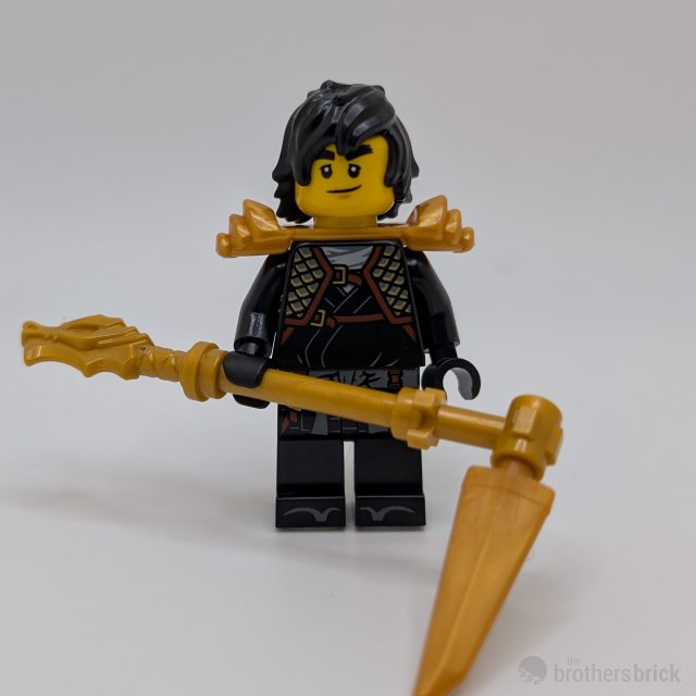 Cole wears his classic Black ZX suit with golden armor. He also lacks his hood, instead featuring a messy head of hair. His head features a friendly smile as well as a grumpy frown. Cole’s long golden scythe is a classic callback to his signature weapon in earlier seasons.