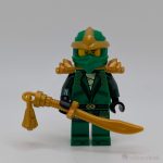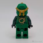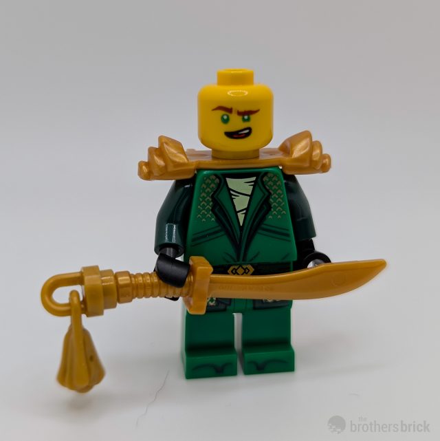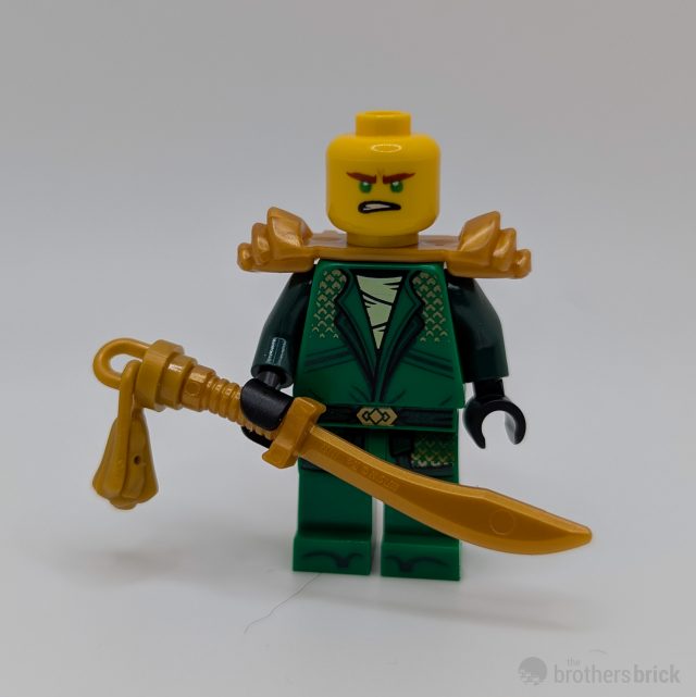 Lloyd wears his classic green ninja ZX apparel with golden shoulder pauldrons and gold highlights replacing the classic silver on his mask.