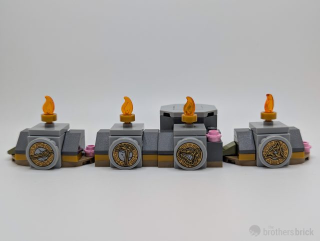 The statue of the first Spinjitsu master features a stone base section atop which the statue rests, nestled between four burning torches. These little sections can each be removed and used within the city build, should you choose to include the statue as a part of the city’s layout.